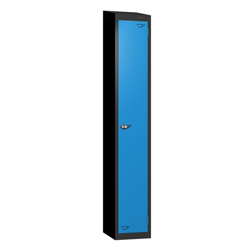 1 Tier Sloping Top Steel Lockers, Tier- sloping top 1950H x 380W x 380D Each door fitted with our Secure Cam lock (2 keys included) Finish Carcass- Black Doors- Cobalt Blue